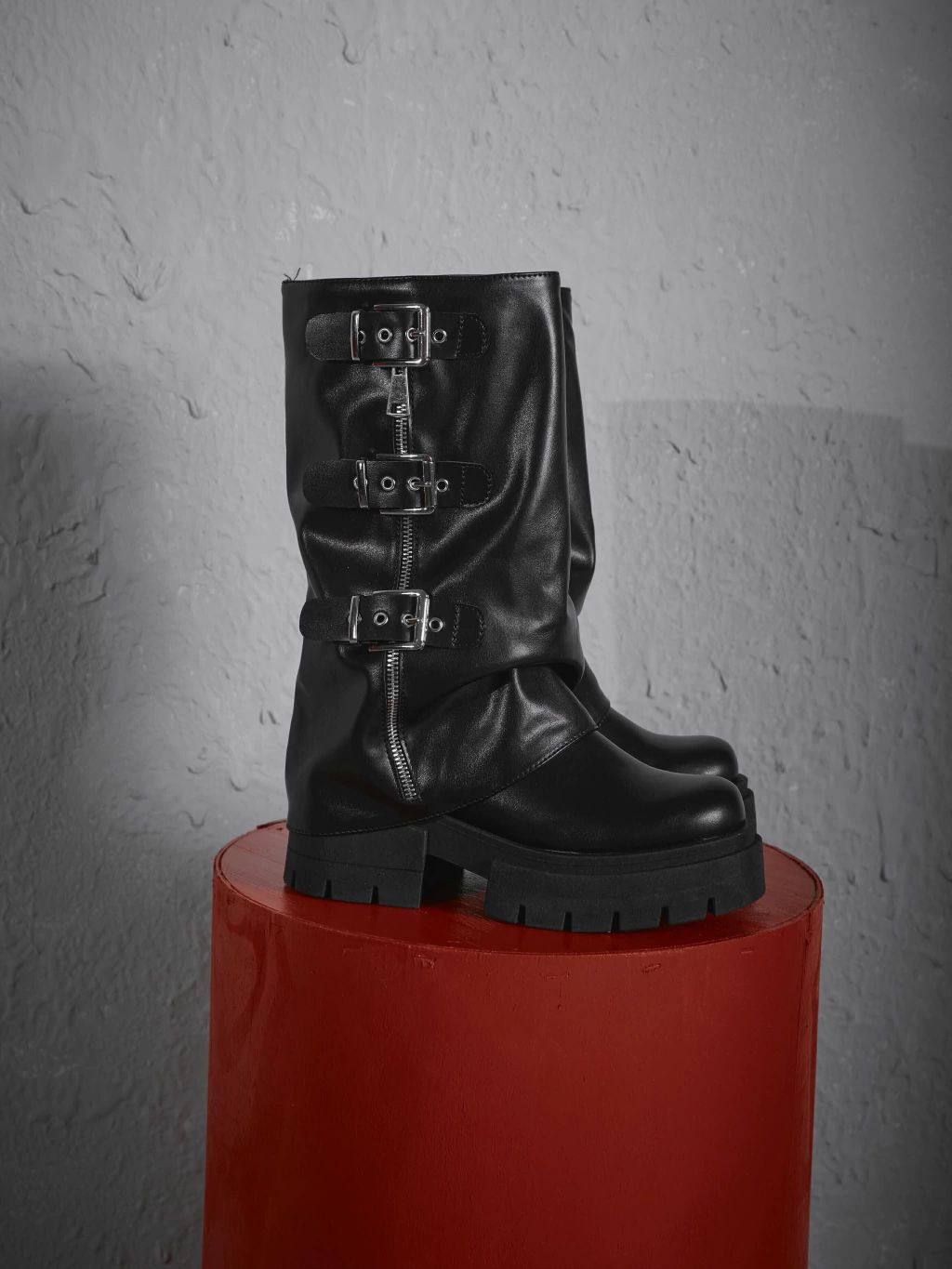 Bota media con base inyectada de goma y taco tipo borcego. Diseño con tres hebillas metálicas, cierre lateral y puntera redondeada. Modelo firme y súper cómodo, ideal para sumar estilo a tus looks urbanos.