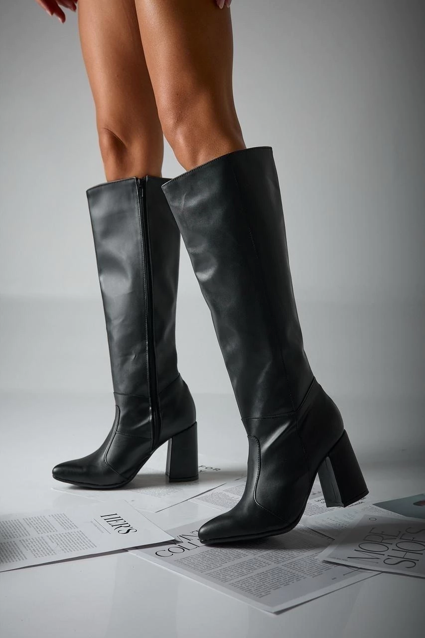 Bota alta con taco ancho de aproximadamente 8 cm, cierre lateral y puntera fina. El diseño estiliza la pierna y aporta estructura, ideal para looks de noche o estilismos urbanos con presencia.