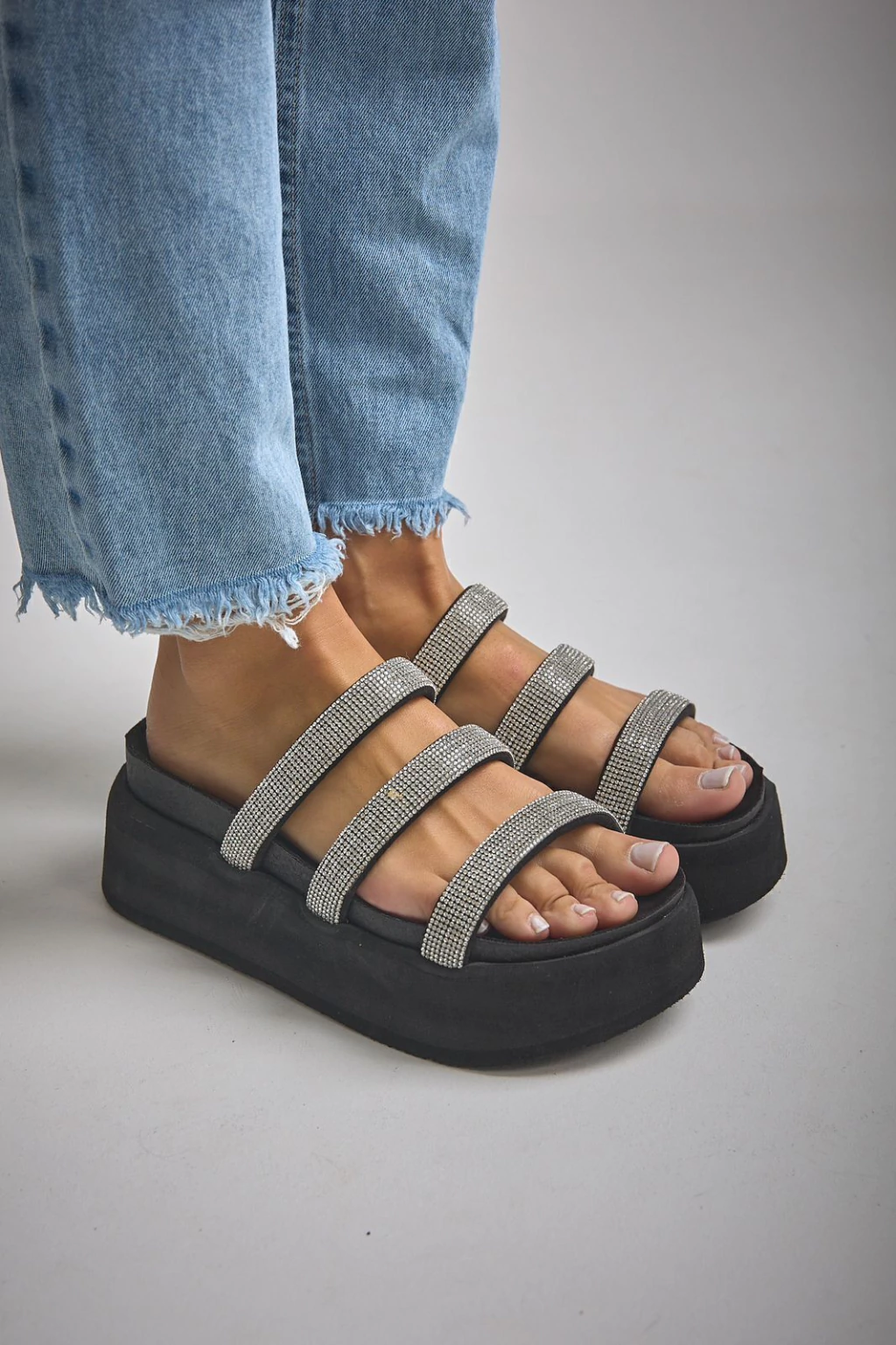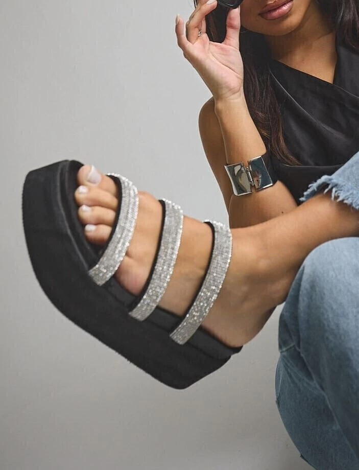 Sandalia con base de goma eva de 6 cm, liviana y cómoda. Capellada con tres tiras finas cubiertas de strass, ideal para sumar glamour a tus looks de verano. Diseño moderno, versátil y con calce firme.