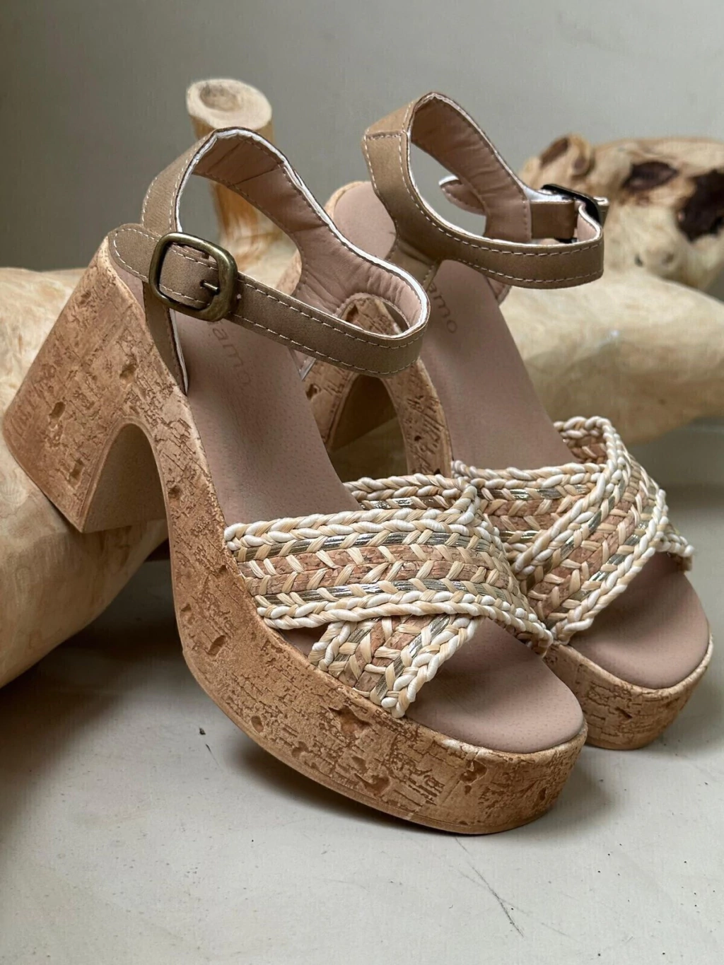 Sandalia con plataforma símil corcho de 7 cm, liviana y con buena estabilidad. Capellada tejida en tonos naturales, con diseño cruzado y pulsera con hebilla metálica. Estilo fresco y artesanal, ideal para elevar tus looks de verano.