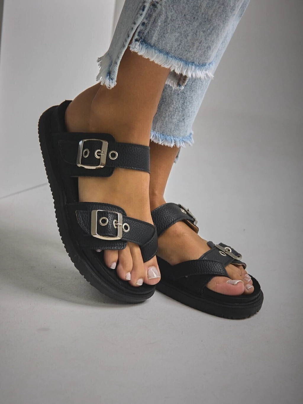 Sandalia en ecocurero texturado con dos tiras ajustables y hebillas metálicas. Base de goma con diseño anatómico, ideal para uso diario.