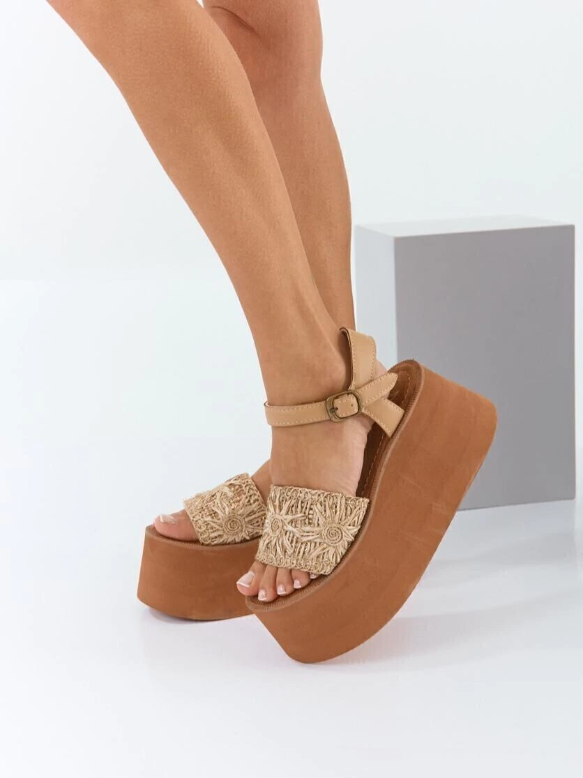 Modelo con base de goma eva de 9 cm, súper liviana y cómoda. Capellada en rafia trabajada con diseño artesanal y tiras anchas.