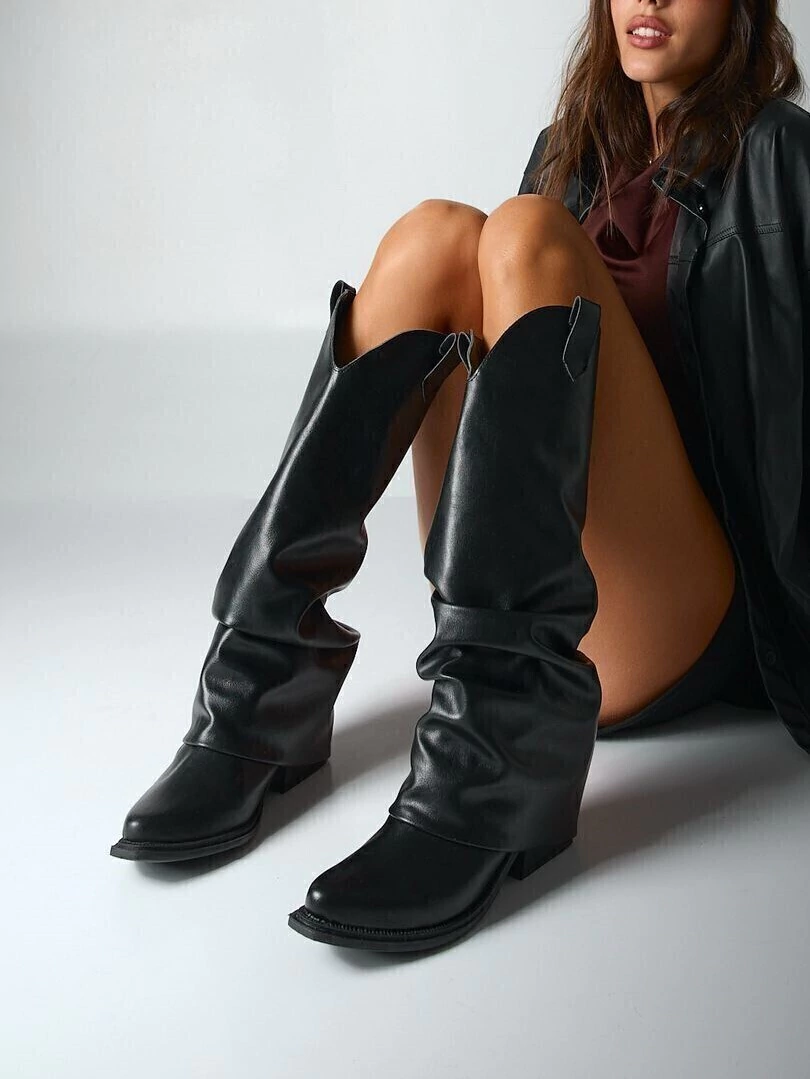 Modelo con punta fina y taco bajo de aproximadamente 4,5 cm. Caña alta con efecto arrugado, cuero blando y tiradores laterales.