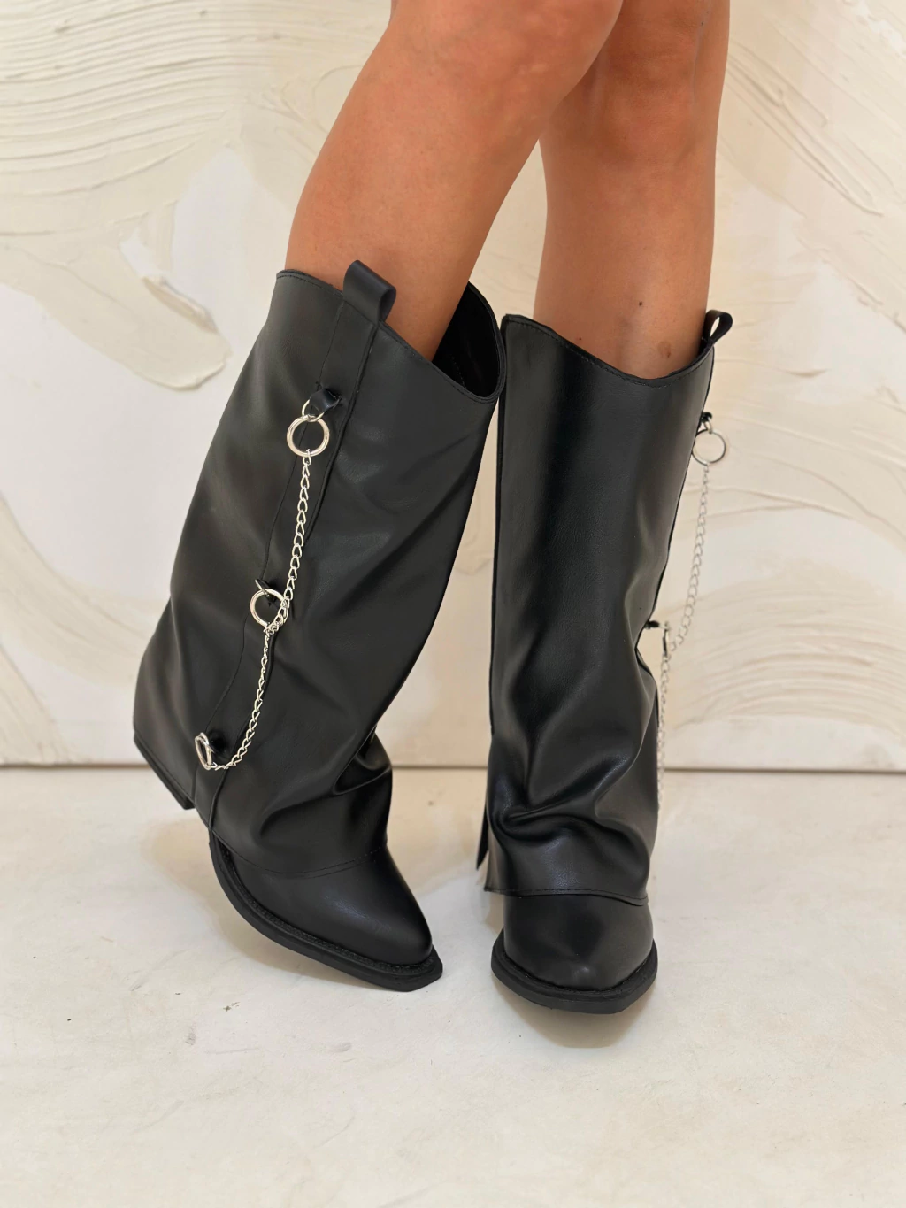 Bota caña alta en cuero sintético negro, con punta ligeramente en punta y taco bajo cuadrado. Incluye detalle lateral fijo de cadena metálica.