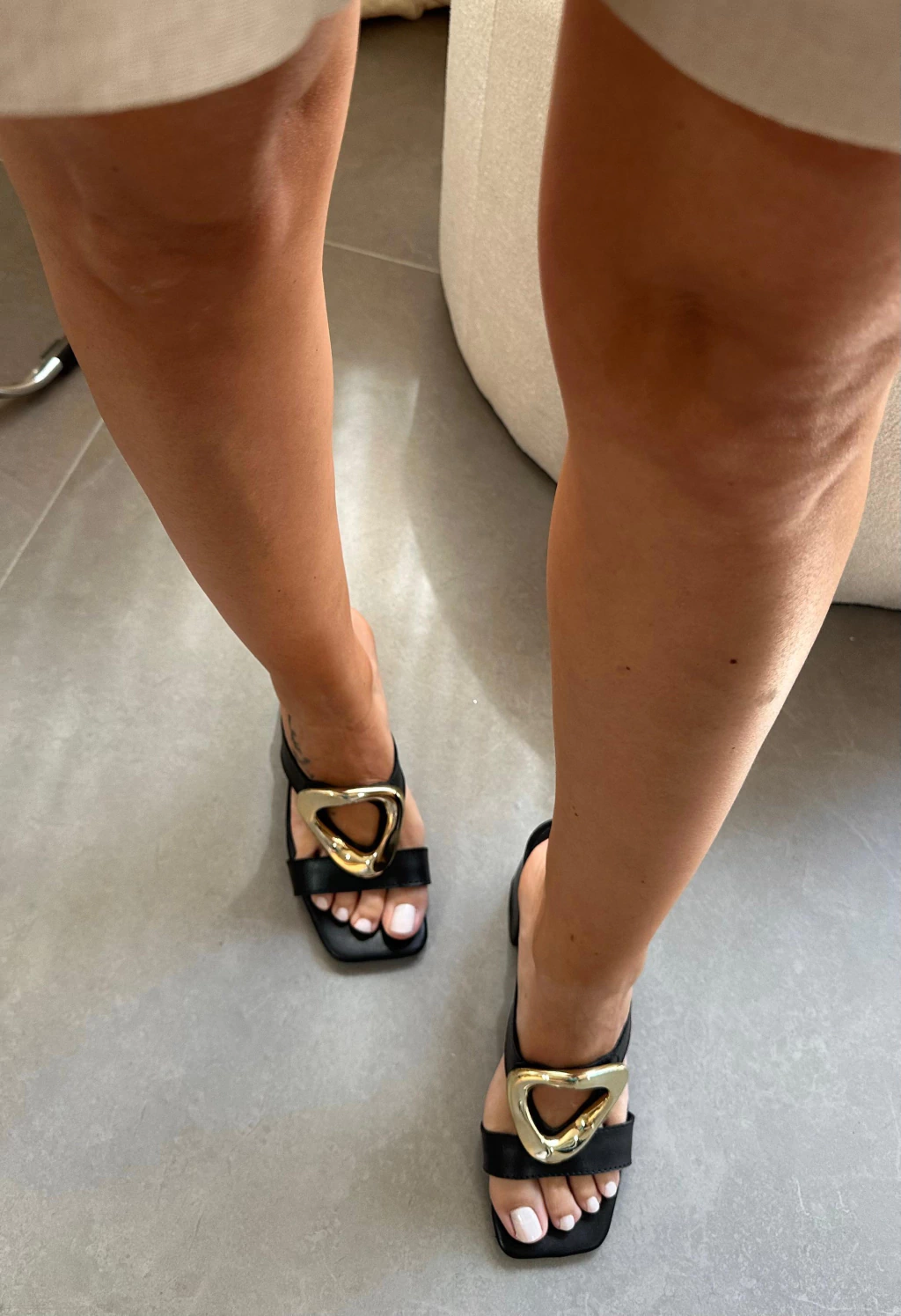 Sandalia con taco ancho de 6 cm, base antideslizante y aplique metálico importado sobre la capellada. Diseño elegante y cómodo, ideal para elevar tus looks sin perder estabilidad.