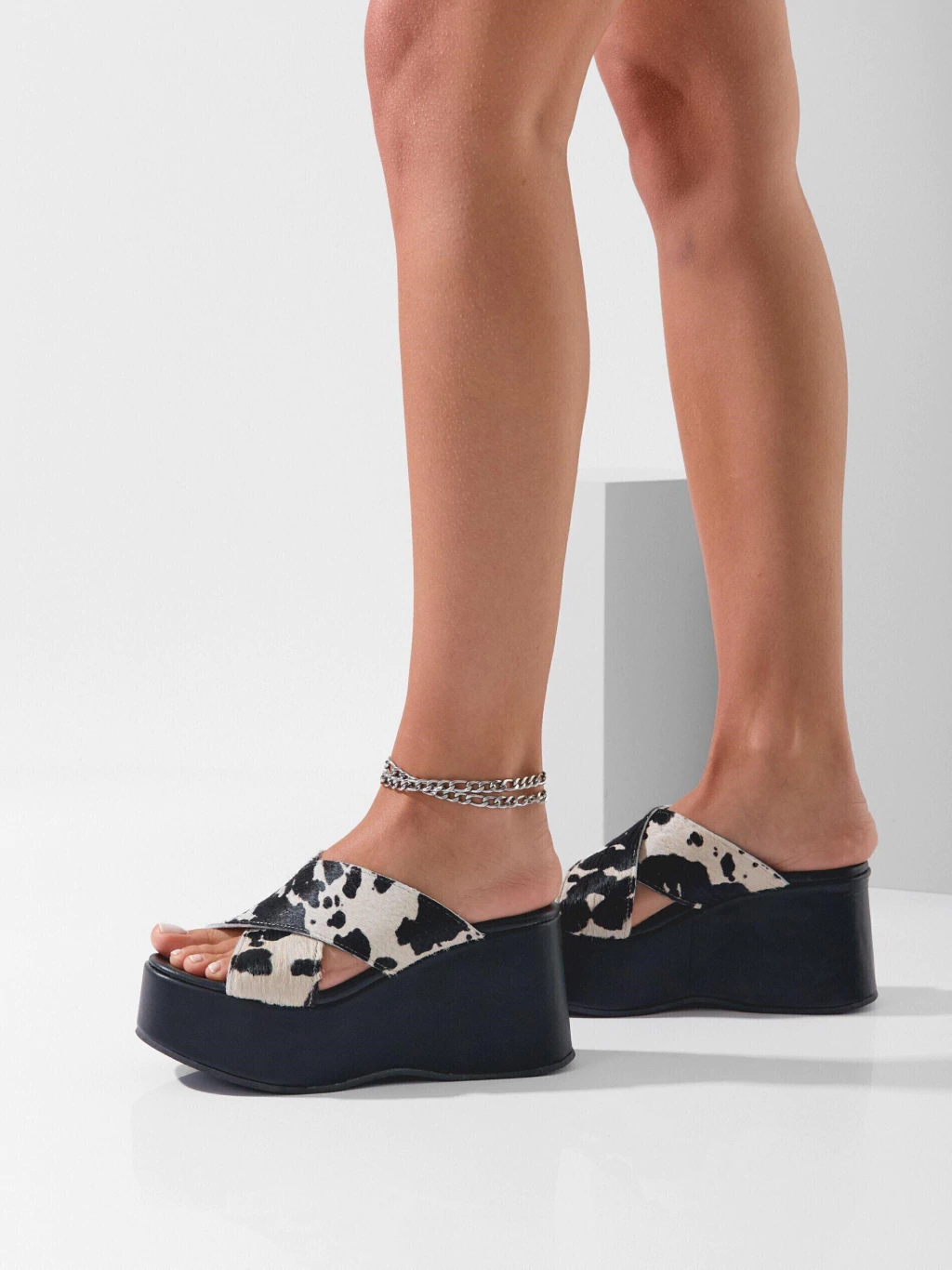 Sandalia con base de 8 cm y capellada con textura croco. Diseño 100% cuero, con tiras anchas y calce cómodo.